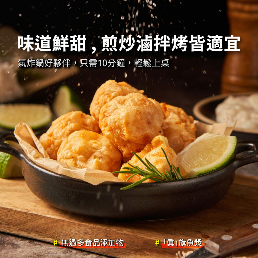 成分:花枝、磷酸二澱粉、旗魚漿、豬背脂油、食鹽、L-麩酸鈉、品質改良劑(多磷酸鈉、焦磷酸鈉)、甜味劑(蔗糖素)