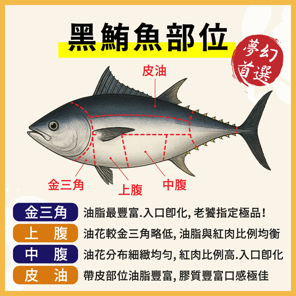 金三角:位於魚下巴與腹部交界處,油脂最豐富、入口即化,是老饕指定的極品!
